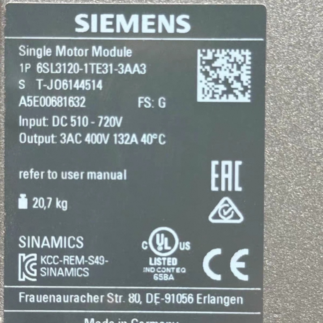 6SL3120-1TE31-3AA3/SINAMICS S120 single motor module input: 600V DC output: 3AC 400V, 132A structural form: book size internal air cooling optimized pulse graphics and support for extended safety integration functions including DRIVE CLiQ cable